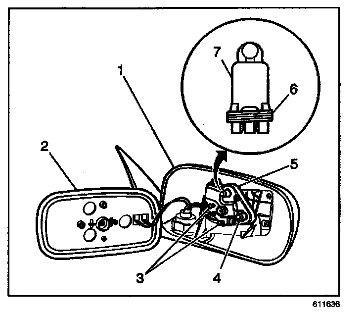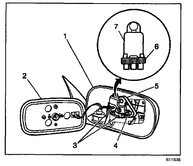 REMOVAL PROCEDURE1. Remove the standard mirror glass assembly (2) from the housing (1) of the outside rear view mirror assembly.