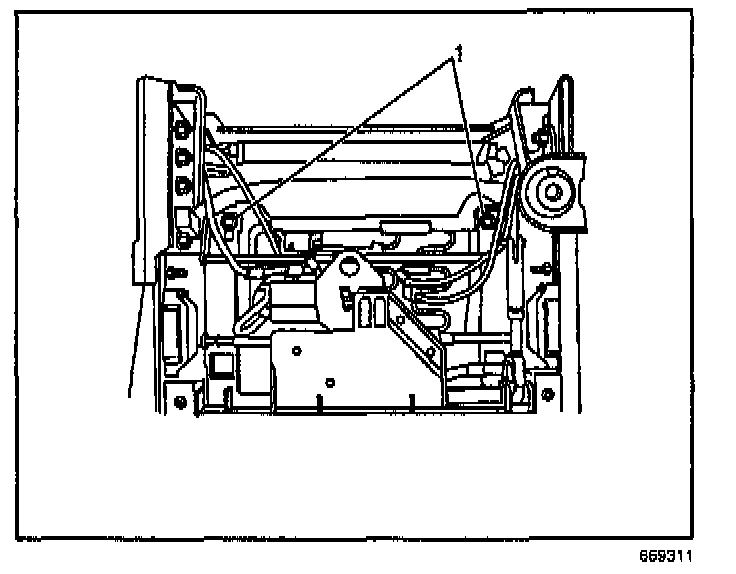 2. Adjust the front seat assembly up and forward in order to access the fasteners (1) at the rear of the front seat cushion assembly.