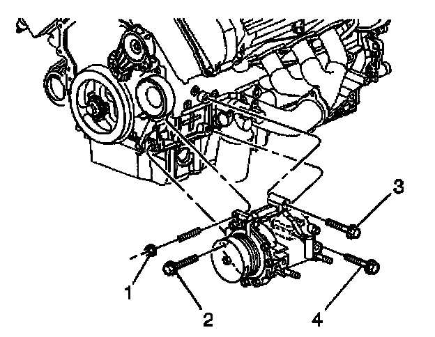 13. Remove the A/C compressor mounting fasteners (1,2,3,4).