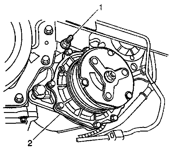 14. Remove the A/C Compressor (2) mounting stud (1).