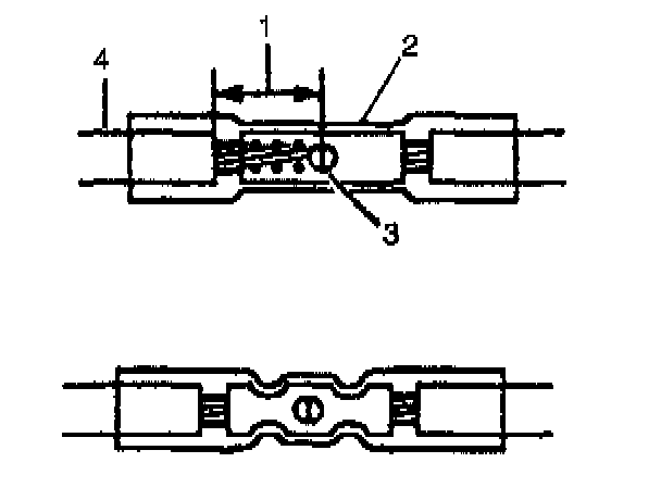 9. Insert the wires into the splice sleeve until the wire hits the barrel stop. The splice sleeve has a stop in the middle of the barrel in order to prevent the wire from passing through the splice (3).