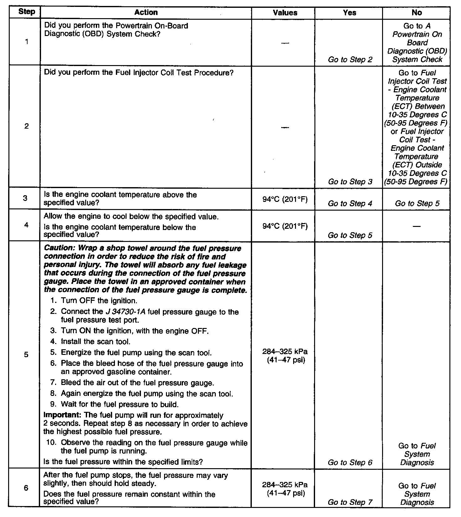 5. The fuel pressure should be within the specified range. If the fuel pressure is not within the specified range, go to Fuel System Diagnosis.
