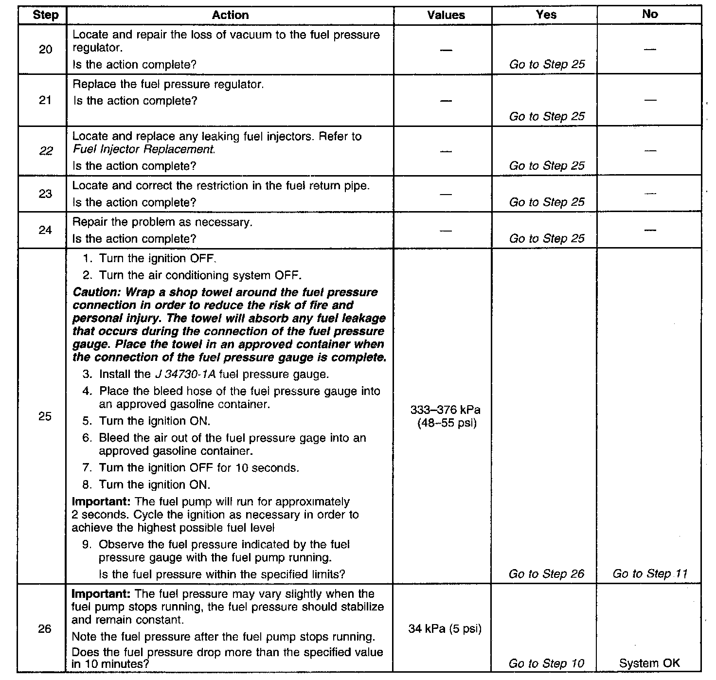 13. This test determines if the high fuel pressure is due to a restricted fuel return pipe or if the high fuel pressure is due to a faulty fuel pressure regulator.