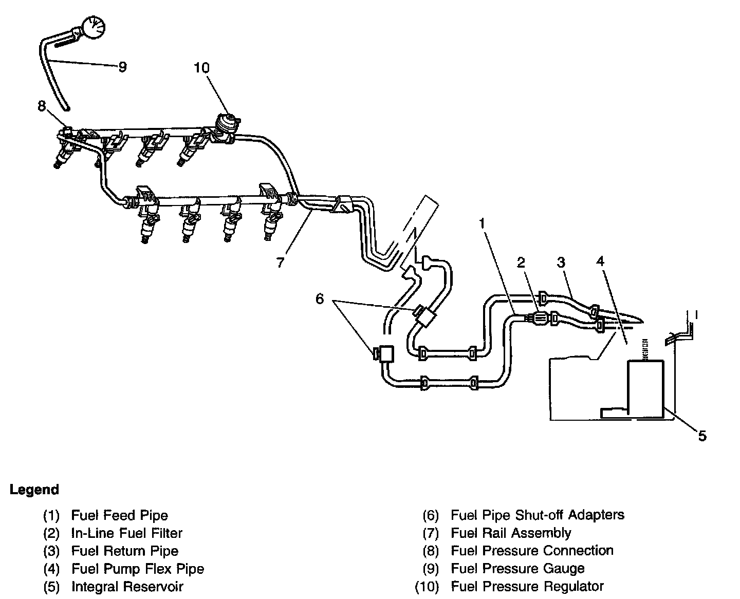 The in-tank fuel pump is an electric pump attached to the fuel sender assembly. The in-tank fuel pump supplies fuel through the fuel flex pipe through the fuel feed output fitting on the molded cover. The fuel then goes to the fuel feed pipe from the through an in-line fuel filter to the fuel rail assembly. The fuel pump is designed to provide fuel at a pressure above the pressure needed by the fuel injectors. A fuel pressure regulator, attached to the fuel rail, keeps the fuel available to the fuel injectors at a regulated pressure. Unused fuel is returned to the fuel tank by a separate fuel return pipe. The J 34730-1A fuel pressure gauge and J 37287 fuel pipe shut-off adapters are use for fuel system diagnosis. The fuel pressure gauge connects to the fuel pressure connection.