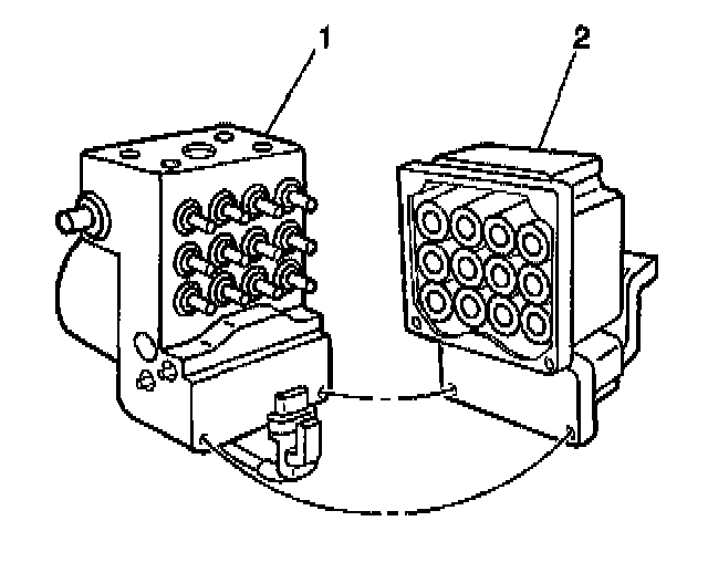 7. Rotate the EBCM connector tab (2) down to the locked position.