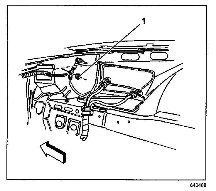 4. Remove the nut (1) securing the battery negative cable to the side rail.