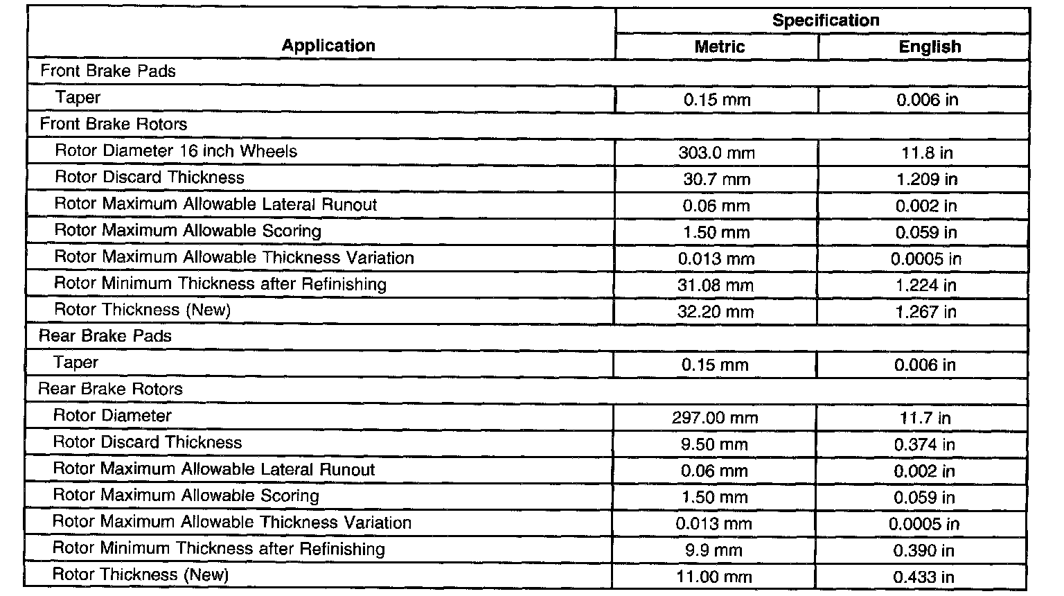 Disc Brake Component Specifications