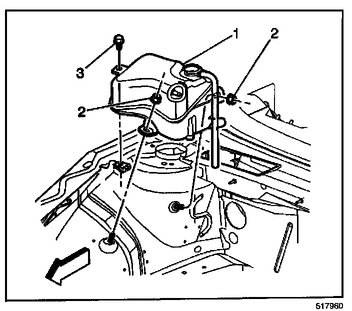 6. Remove the surge tank mounting nuts (2) and bolt (3).