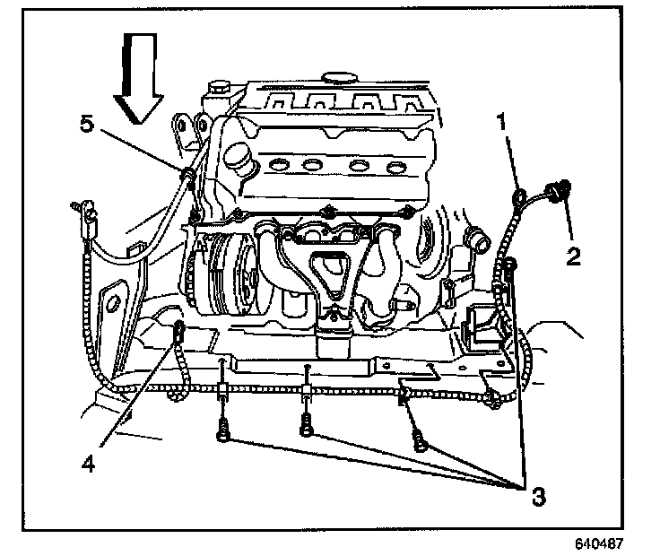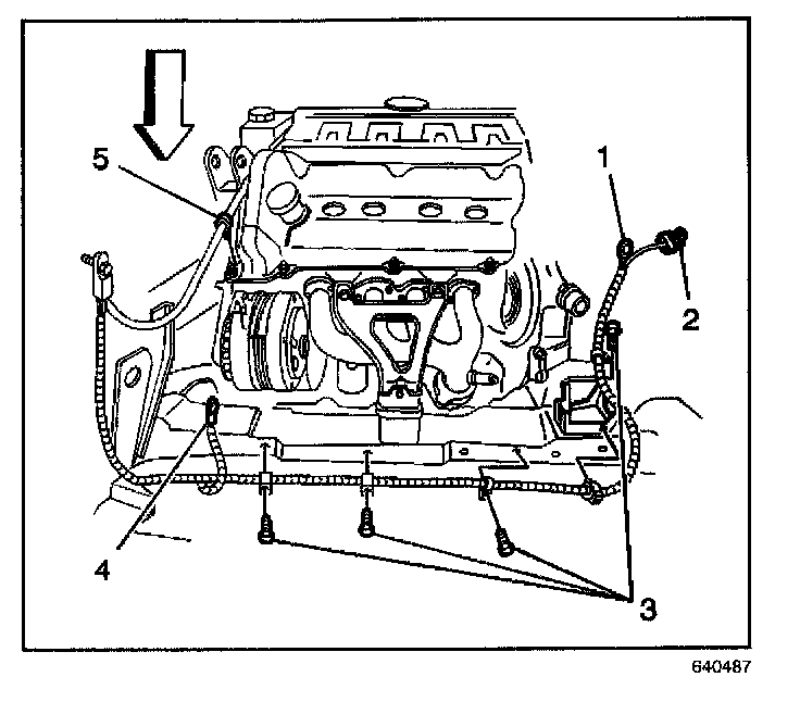 9. Remove the bolts (3) attaching the cable harness clips to the engine frame.