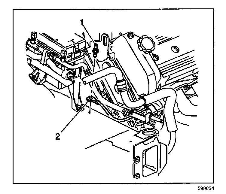 2. Remove the bolt (1) securing the engine ground cable (2) to the right side body frame rail.