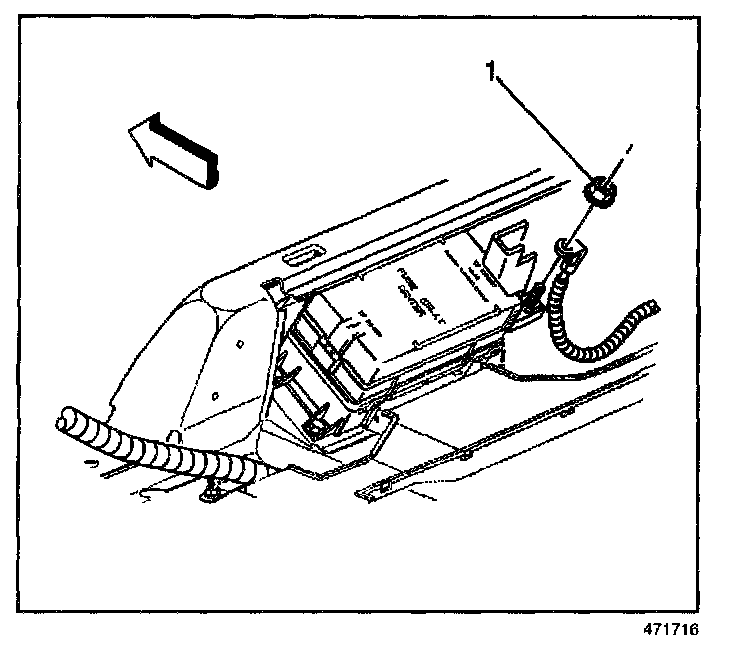 3. Remove the nut (1) securing the positive battery cable to the rear fuse block.