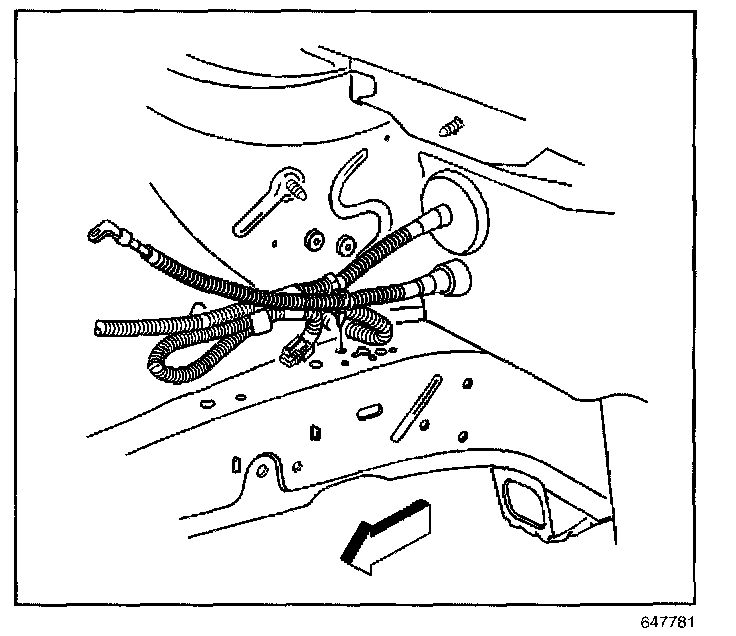 1. Slide the battery cable (1) through the opening in the cowl panel (3) and seat the cable grommet (2) by pulling the cable forward into the engine compartment.