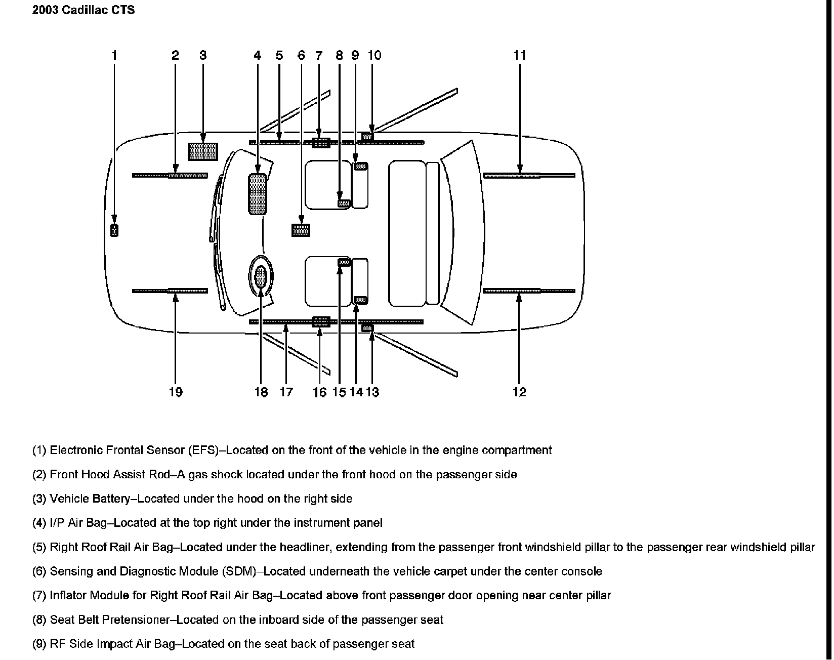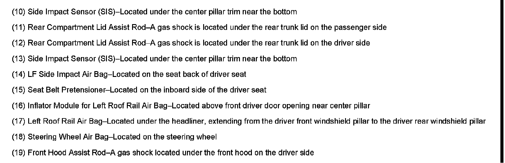 The SIR Zone Identification Views shown below illustrate the approximate location of all SIR components available for the vehicle. This will assist in determining the appropriate SIR Disabling and Enabling Zones for a given service procedure, refer to SIR Disabling and Enabling Zones.