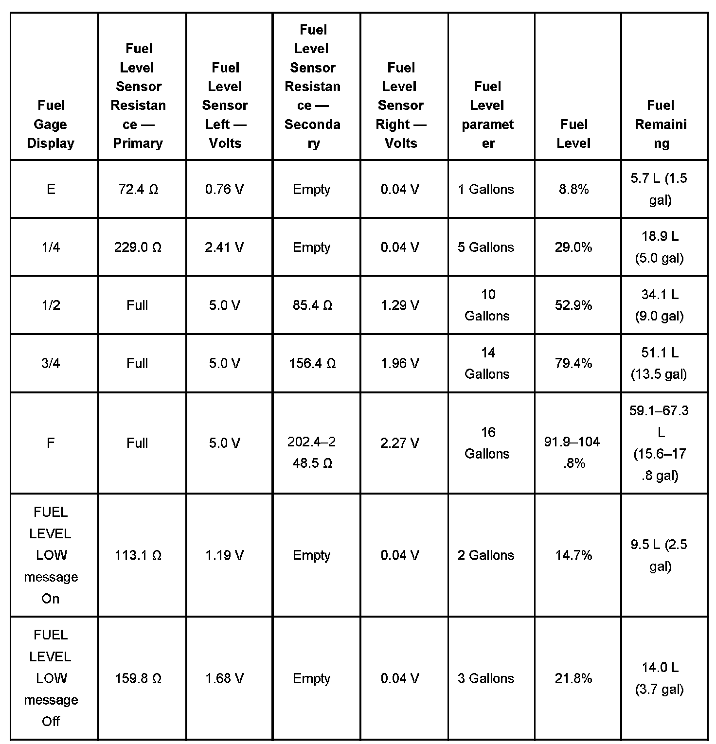 The values in the table are approximate values based on information obtained from properly operating vehicles. Actual results may vary slightly.