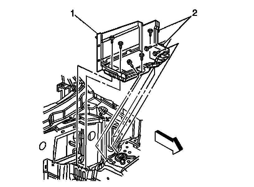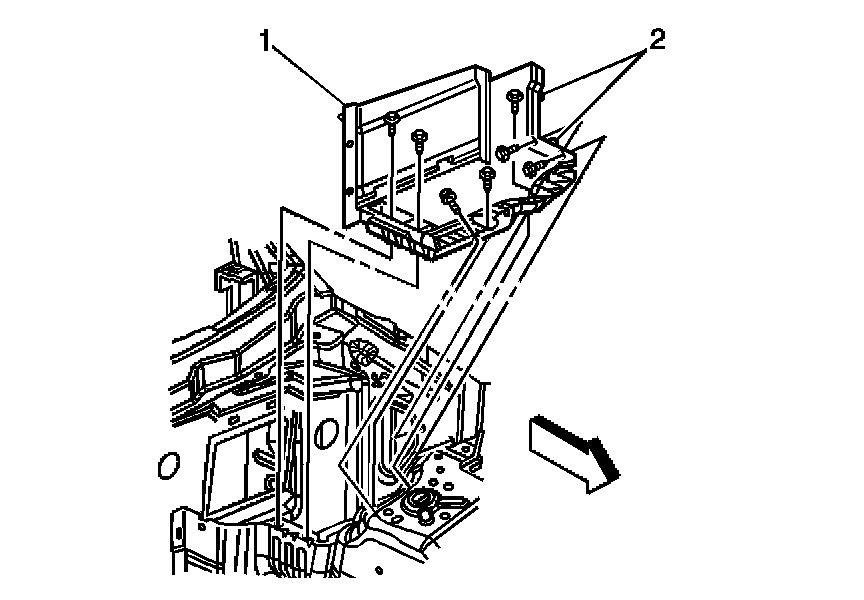 1. Position the battery tray (1) to the vehicle, locating the alignment datums (2) with the holes in the inner fender.