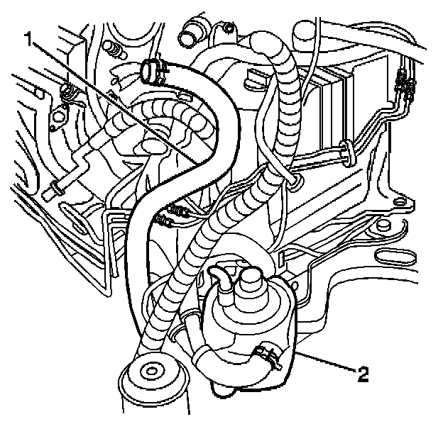 3. Lower the splash shield far enough to gain access to the secondary air injection (AIR) pump (2) assembly.