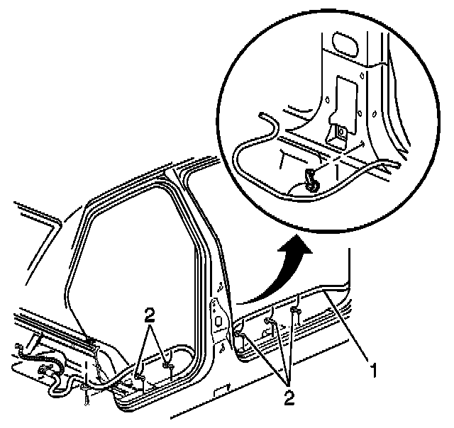 4. Route the battery cable (1) along the rocker panel and install the cable retainers (2).