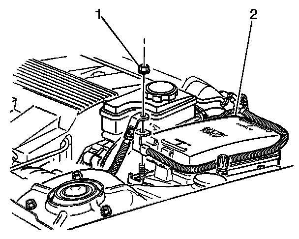 7. Disconnect the positive battery cable from the underhood fuse block (2).