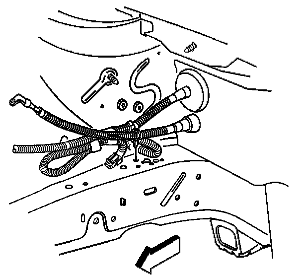 10. Carefully remove the battery cable (1) from the vehicle by pulling the cable through the cowl panel (3) and out of the vehicle.