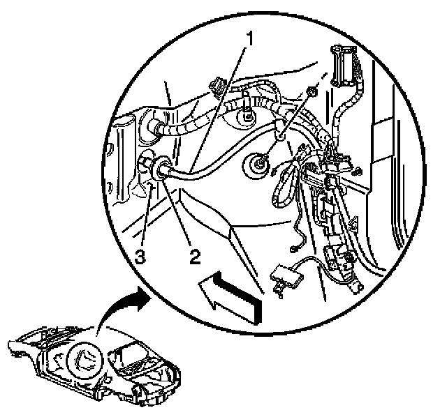 1. Slide the battery cable (1) through the opening in the cowl panel (3) and seat the cable grommet (2) by pulling the cable forward into the engine compartment.