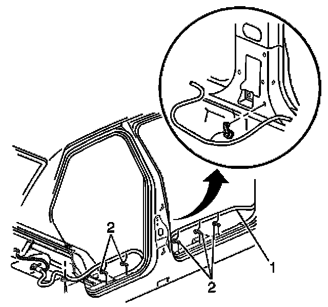 6. Remove the battery cable retainers (2) from the rocker panel area.