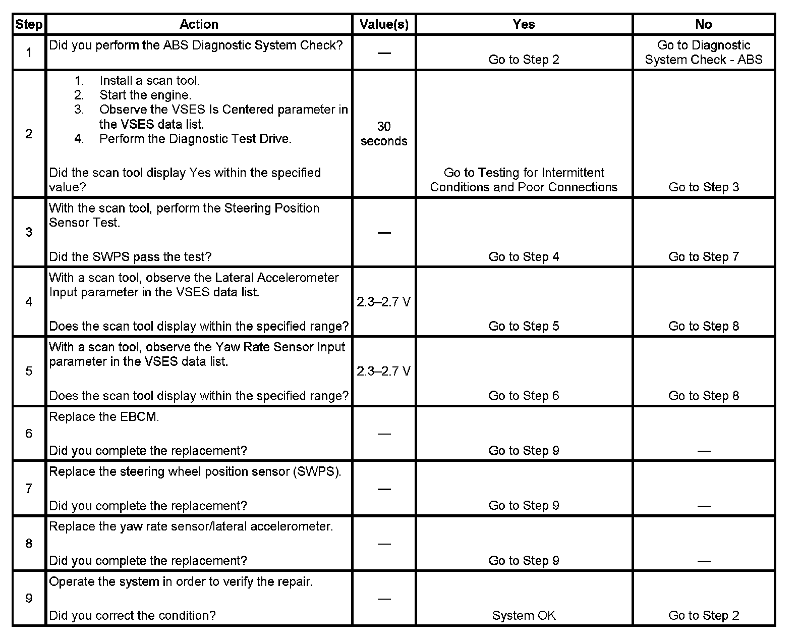 The Vehicle Stability Enhancement System (VSES) is activated by the Electronic Brake Control Module (EBCM) calculating the desired yaw rate and comparing it to the actual yaw rate input. The desired yaw rate is calculated from measured steering wheel position, vehicle speed, and lateral acceleration. The difference between the desired yaw rate and actual yaw rate is the yaw rate error, which is a measurement of oversteer or understeer. If the yaw rate error becomes too large, the EBCM will attempt to correct the vehicle's yaw motion by applying differential braking to the left or right front wheel.