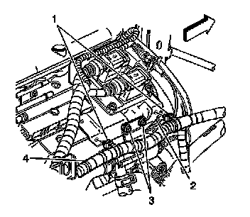 5. Disconnect the 2 cable harness clips (1) securing the engine wiring harness (4) to the ECM bracket (2).