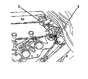 9. Install the bolt (1) securing the throttle body heater inlet hose/pipe to the intake plenum (2).