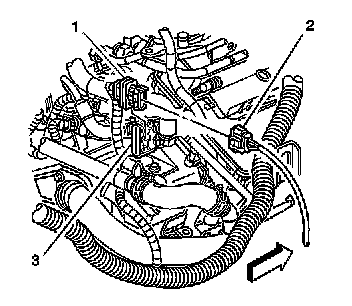 3. Remove the heated oxygen sensor connector (1) from the bracket (3).