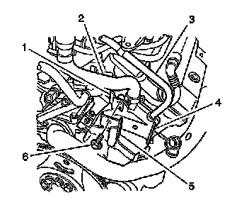 6. Remove the bolt (6) securing the following to the crankcase vent housing (4):