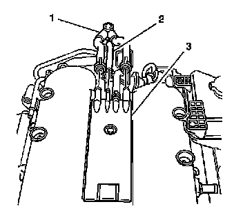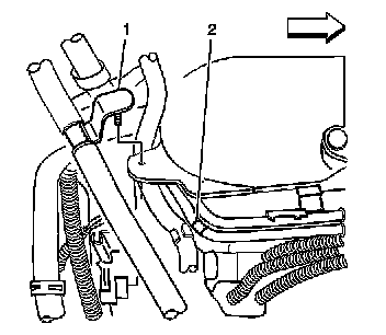 2. Disconnect the crankcase ventilation dirty air hose retainer (2) from the fuel pipe.