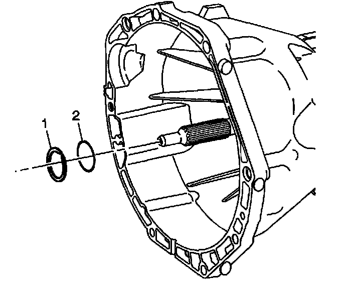 7. Remove the snap ring (1) and shim (2) from the main drive gear.