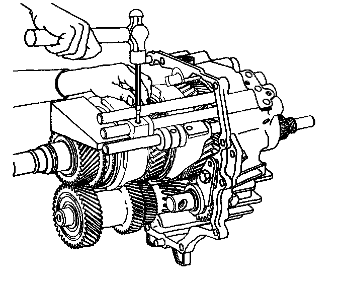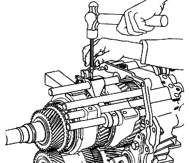 21. Select 4th gear, support the shift selector shaft with a wooden wedge, using a punch, remove the roll pin from the gearshift selector arm. The roll pin will not contact gear teeth on removal.