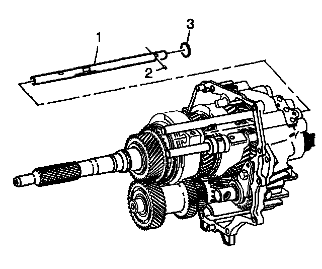 24. While supporting the 3rd/4th shift fork, use a rubber hammer to gently tap the shaft (1) rearward, forcing out the expansion plug (3) in the rear of the transmission housing. This will allow removal of the interlock pin (2) and the shaft from the rear, which overcomes the risk of the interlock pin (2) becoming dislodged and jamming the shaft.