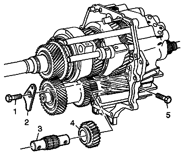26. Remove the rear bolt (5) securing the reverse idler gear to the transmission case and the bolt (1) securing the thrust plate (2). Remove the reverse idler gear shaft (3), from the rear case section. Remove the idler gear.