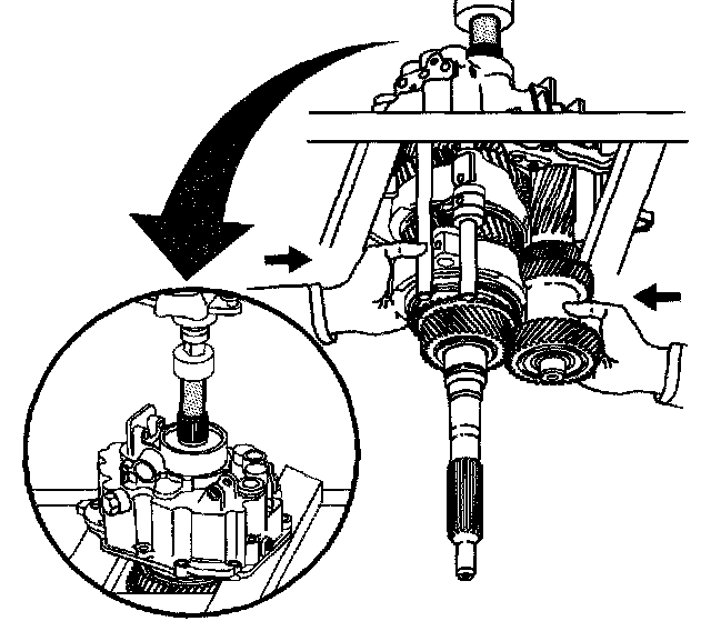 25. Move the 1st/2nd synchromesh ring forward into the 2nd gear position and the 5th/reverse synchromesh ring forward, into the reverse position.