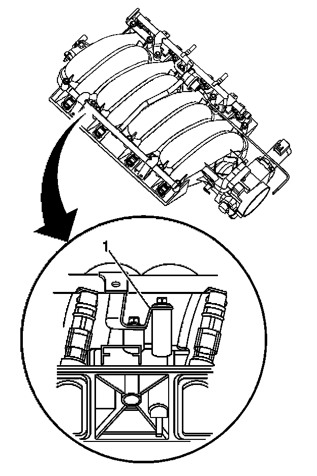 2. Note the location of the fuel rail ground strap (1) on the intake manifold. The fuel rail ground strap must be installed during assembly.