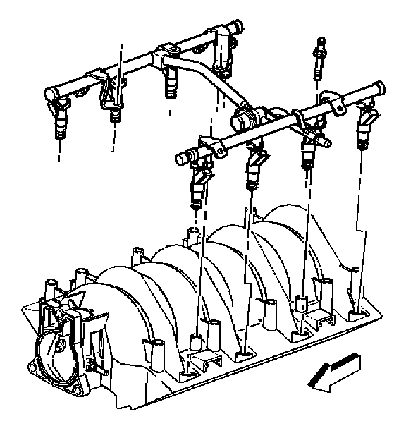 - Carefully remove the fuel rail assembly in order to prevent damage to the injector electrical connector terminals and the injector spray tips.