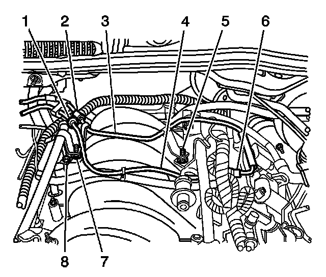 5. Disconnect the engine compartment evaporative emission (EVAP) line (1) from the chassis EVAP line.