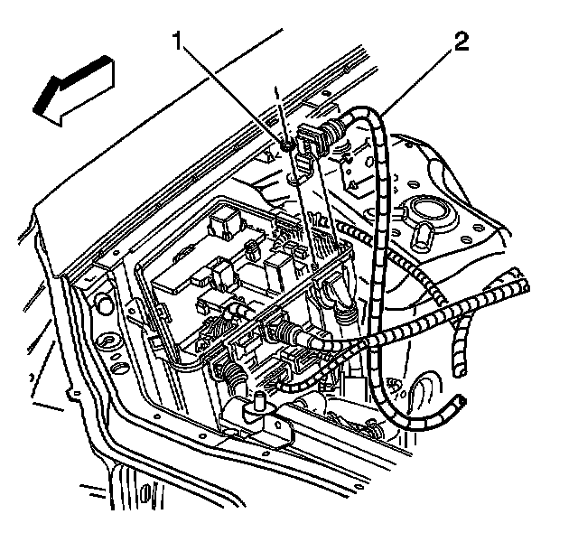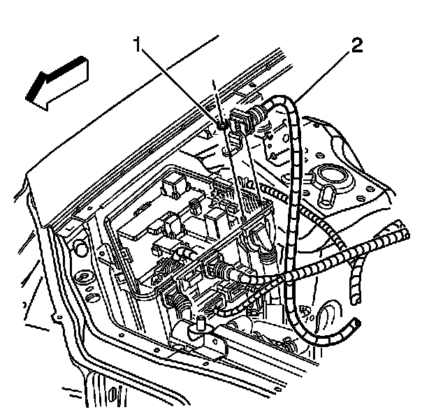 5. Remove the nut (1) securing the battery positive cable (2) to the underhood fuse block.