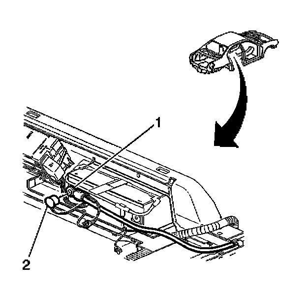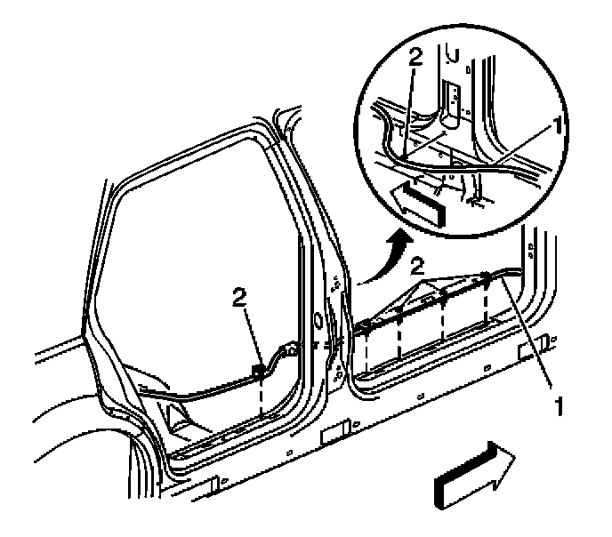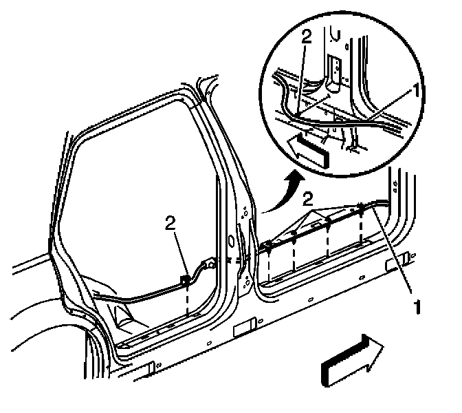 5. Route the battery cable (1) along the rocker panel and install the cable retainers (2).