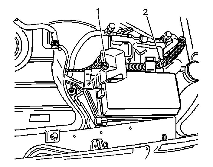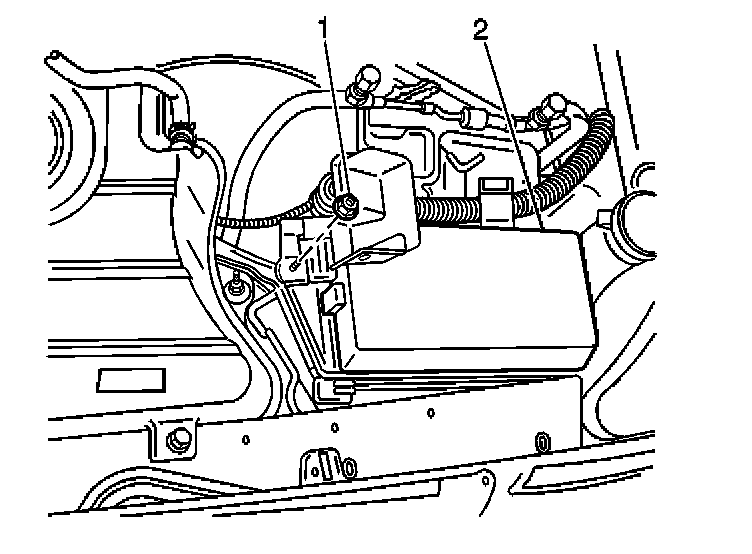 7. Remove the remote positive terminal nut (1) and disconnect the battery positive cable from the underhood fuse block (2).