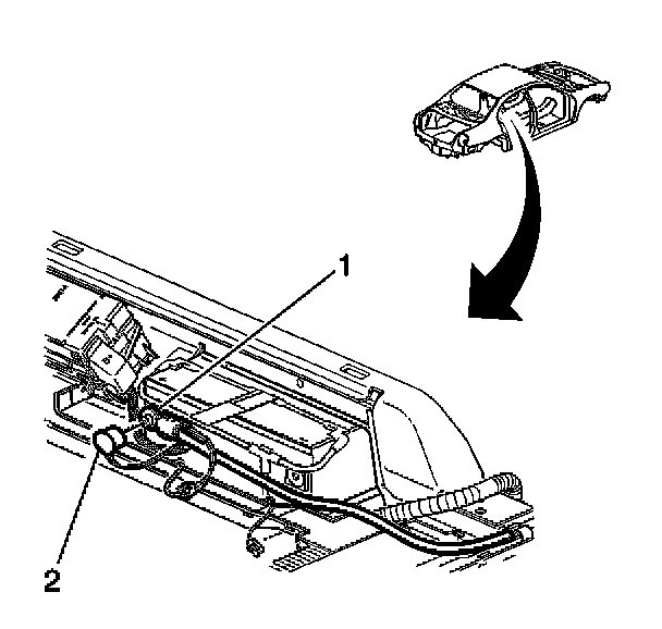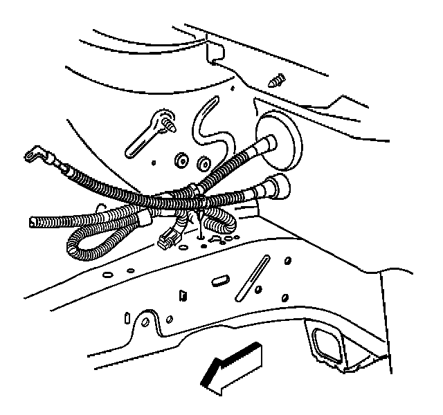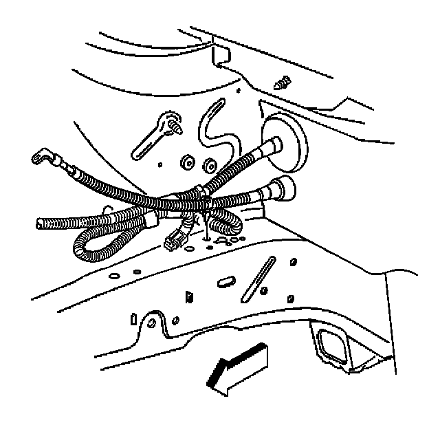 11. Carefully remove the battery cable (1) from the vehicle by pulling the cable through the cowl panel (3) and out of the vehicle.
