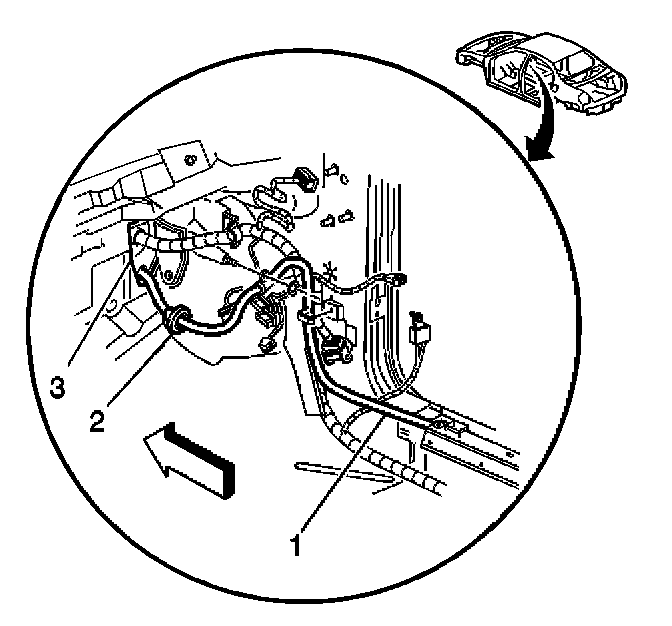 1. Slide the battery cable (1) through the opening in the cowl panel (3) and seat the cable grommet (2) by pulling the cable forward into the engine compartment.