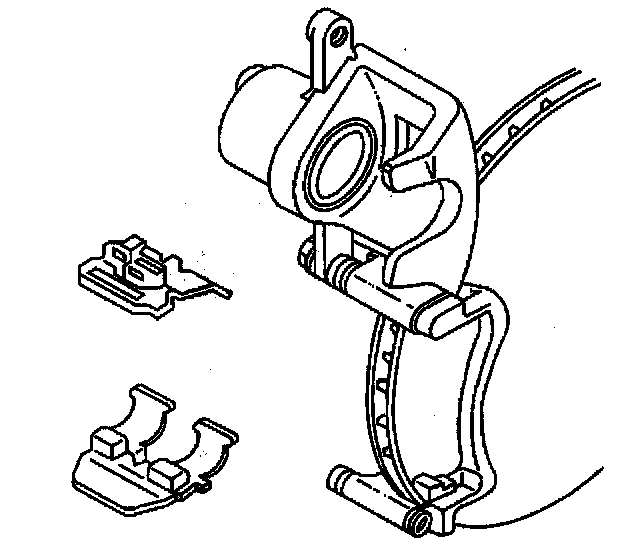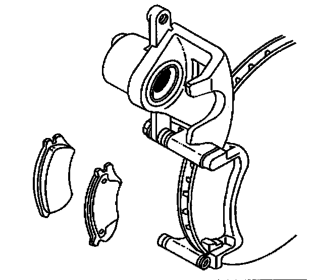 Notice: Support the brake caliper with heavy mechanic's wire, or equivalent, whenever it is separated from it's mount and the hydraulic flexible brake hose is still connected. Failure to support the caliper in this manner will cause the flexible brake hose to bear the weight of the caliper, which may cause damage to the brake hose and in turn may cause a brake fluid leak.