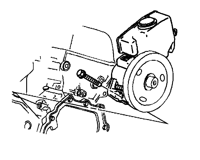 4. Place the power steering pump in position lathe engine valley. Slide the molded wedge into the retaining feature cast into the cylinder block.