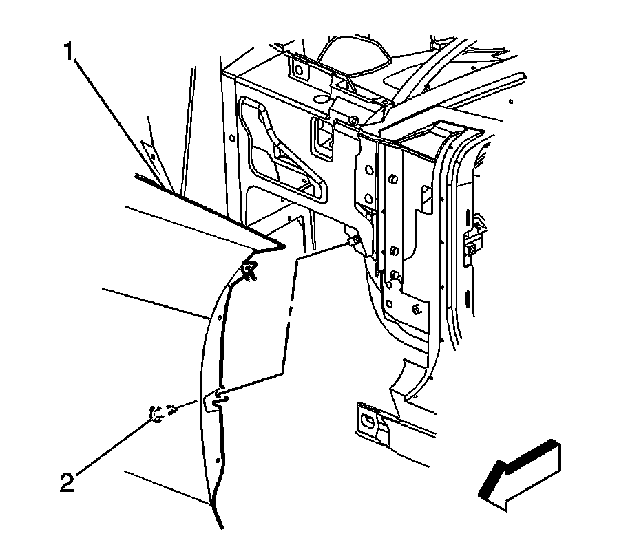 9. Remove the push-in fasteners (1) securing the front portion of the fender (3) to the vehicle.