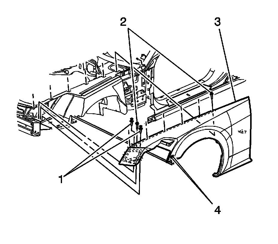 3. Install the bolts (4) securing the front portion of the fender (3) to the vehicle.