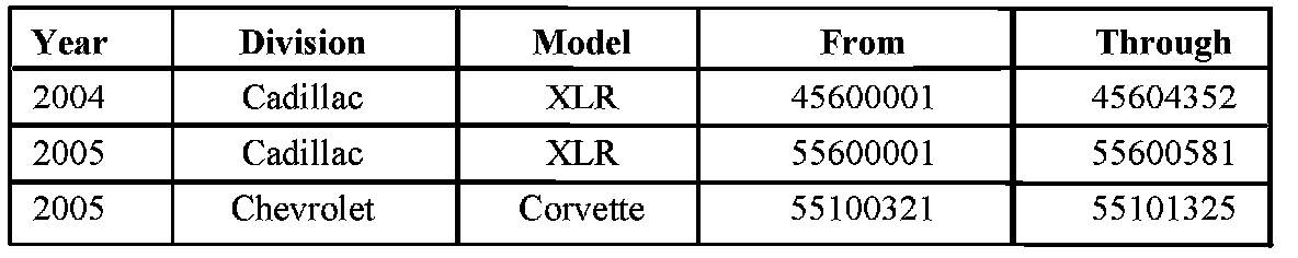 Involved are certain 2004 and 2005 model year Cadillac XLR vehicles, and 2005 model year Chevrolet Corvette vehicles built within the VIN breakpoints shown.