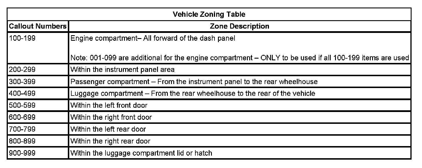All grounds, in-line connectors, pass-through grommets, and splices have identifying numbers that correspond to where they are located in the vehicle. The table explains the numbering system.